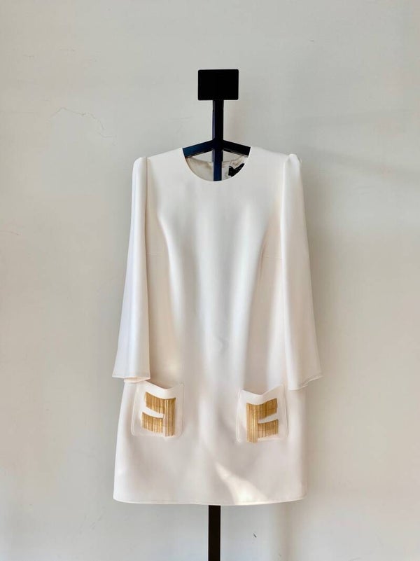 FW '20 Elisabetta Franchi: ivoorkleurige jurk met gouden detail