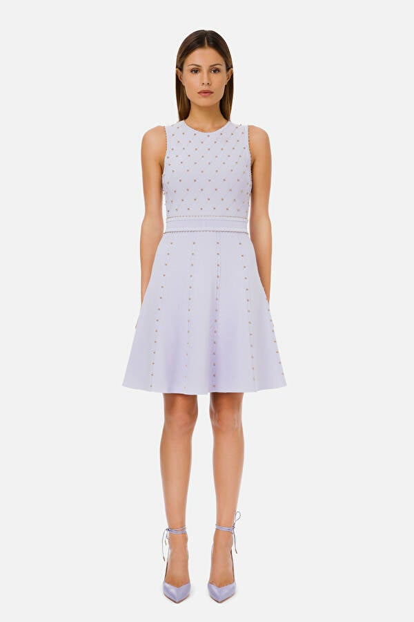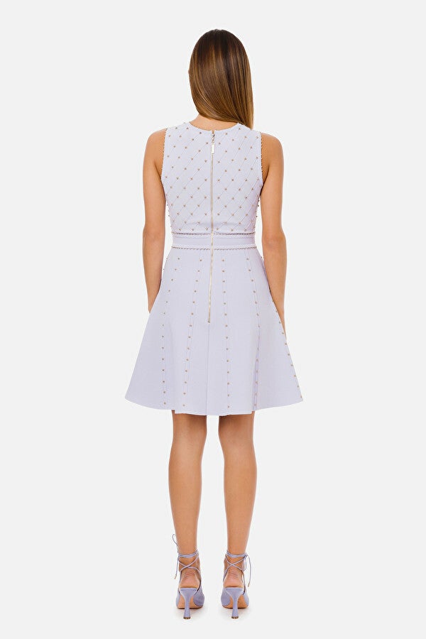 Mouwloze jurk boven de knie met wijd uitlopende rok, ronde hals, top in ruitpatroon borduursels en studs, tailleband en rits aan de achterkant.