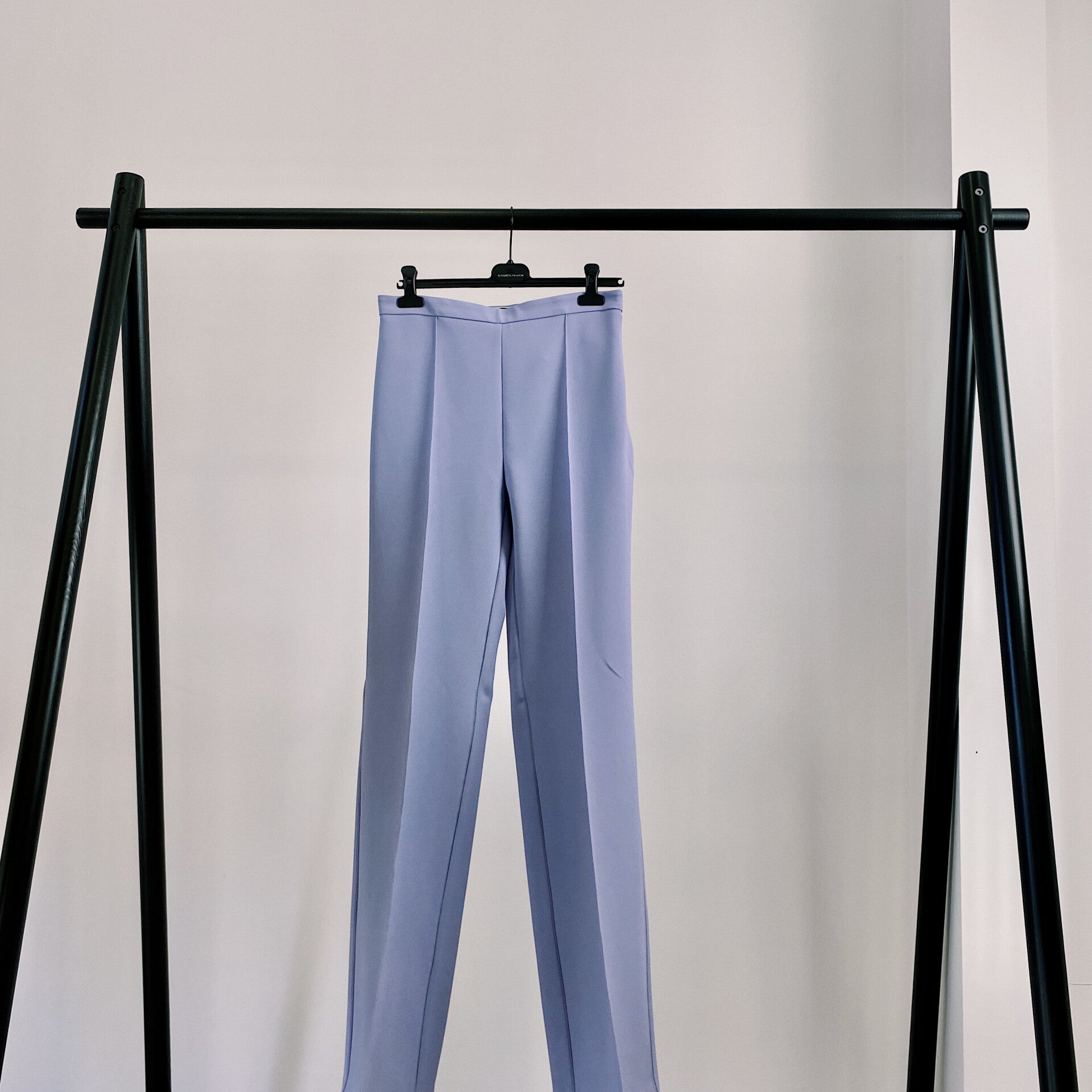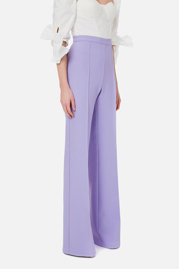 Palazzobroek van dubbele crêpe met hoge taille, stiksels aan de voorkant die het silhouet definiëren en tot aan de onderkant uitlopen, klepzakjes achteraan met gouden knopen en een verborgen ritssluiting.