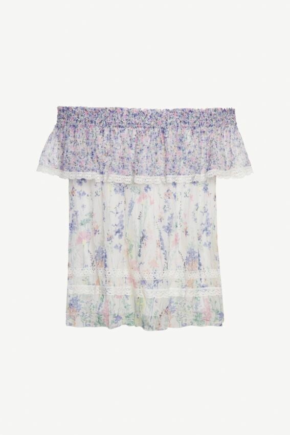 Bardot top in delicate bloemetjesprint met volants aan de hals en kanten inzetstukken.
