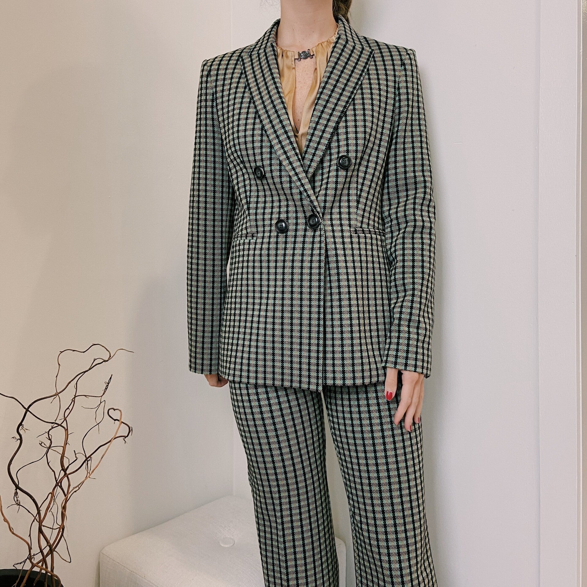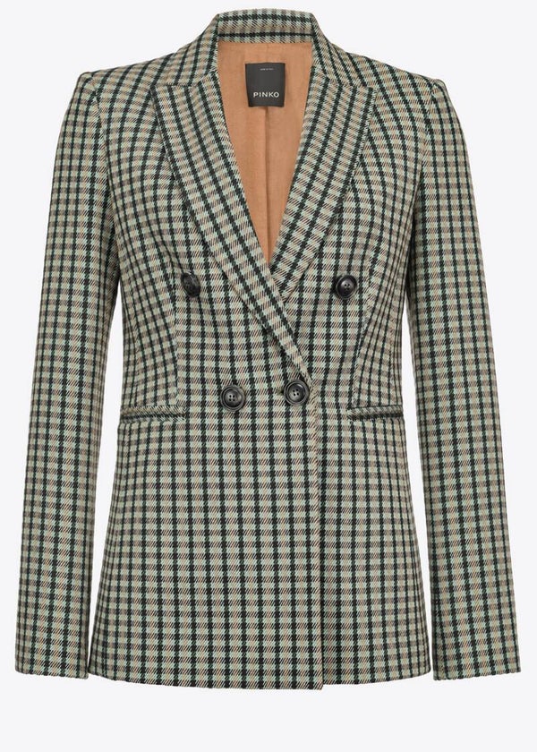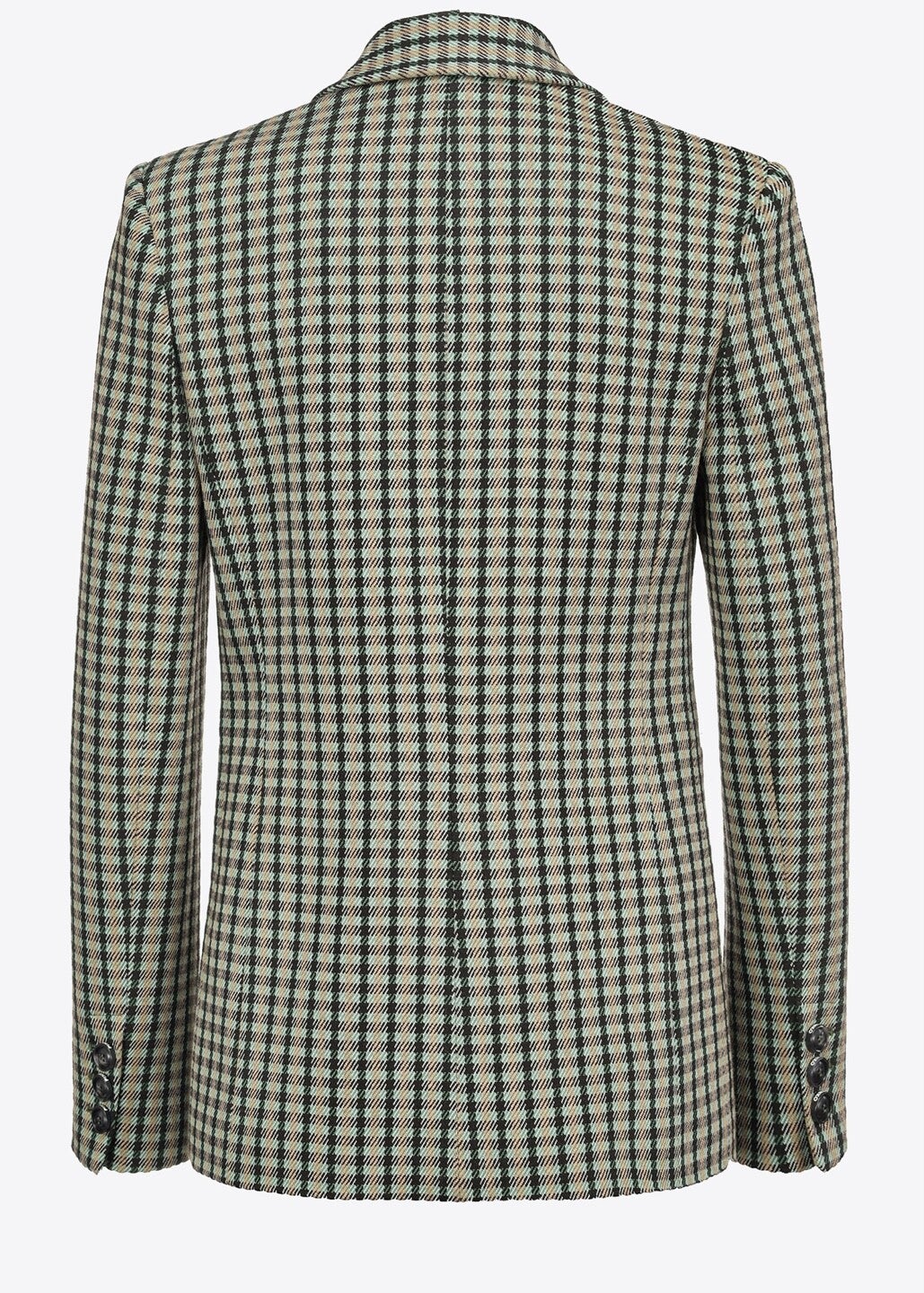 Rechte gebreide blazer van technische viscose met een geruit motief. Kraag met revers en paspelzakken opzij. Gevoerd met contrasterende stof. Knoopsluiting met dubbele rij knopen.