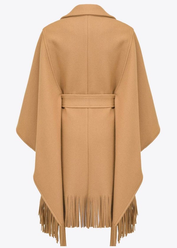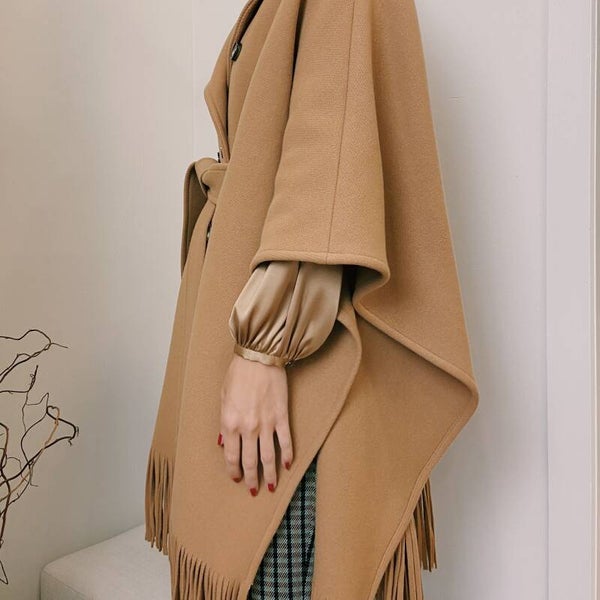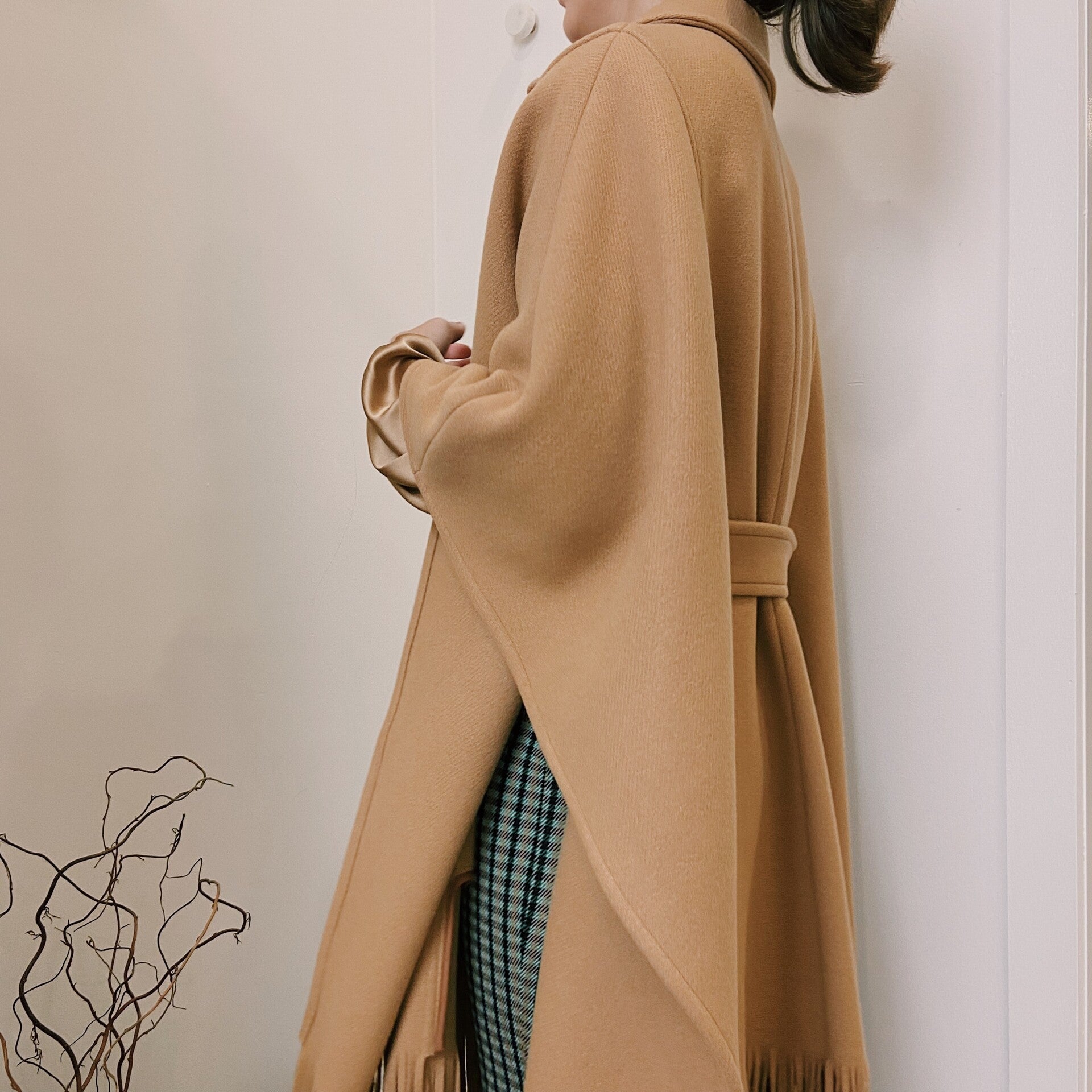 Ruime, ruimvallende capejas van een wollenblendstof, met reverskraag, bijpassende ceintuur van dezelfde stof die om de taille wordt geknoopt en franje onderaan. Gevoerd. Knoopsluiting met dubbele rij knopen.