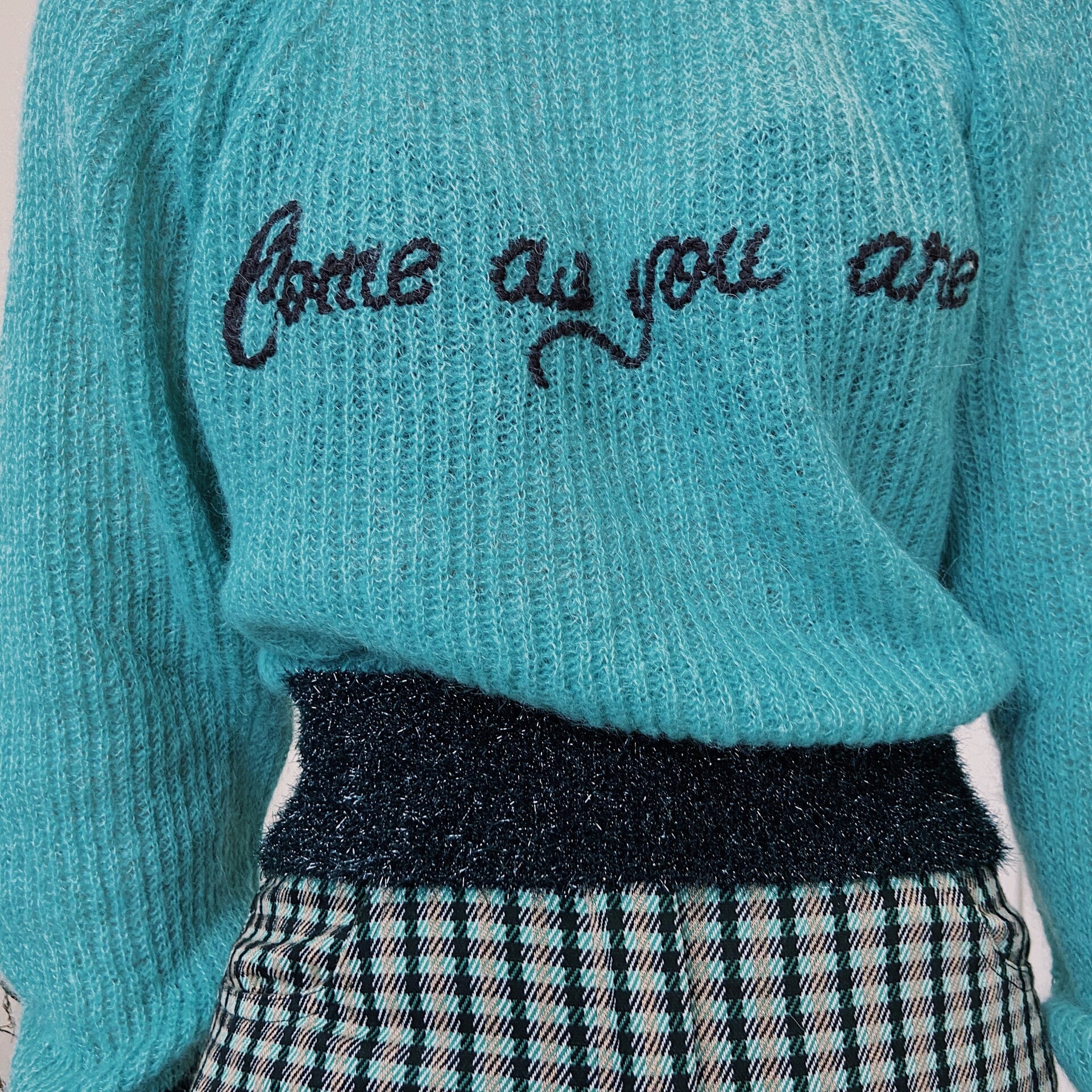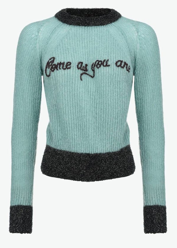 Trui met lange mouwen van geribd, alpaca-blend garen, met gebreide lurex rond de hals, manchetten en zoom. Geborduurd opschrift "Come As You Are" op de voorkant.