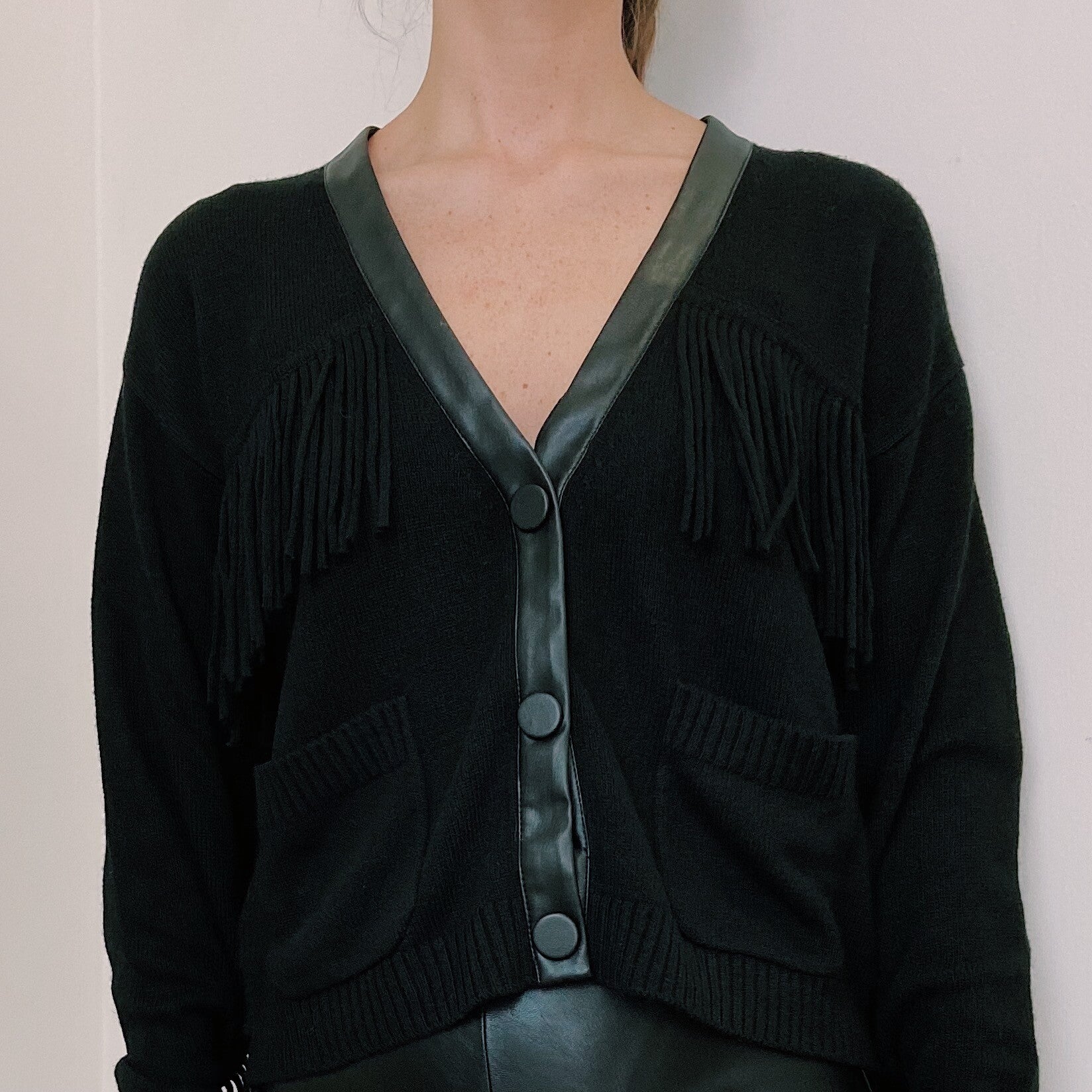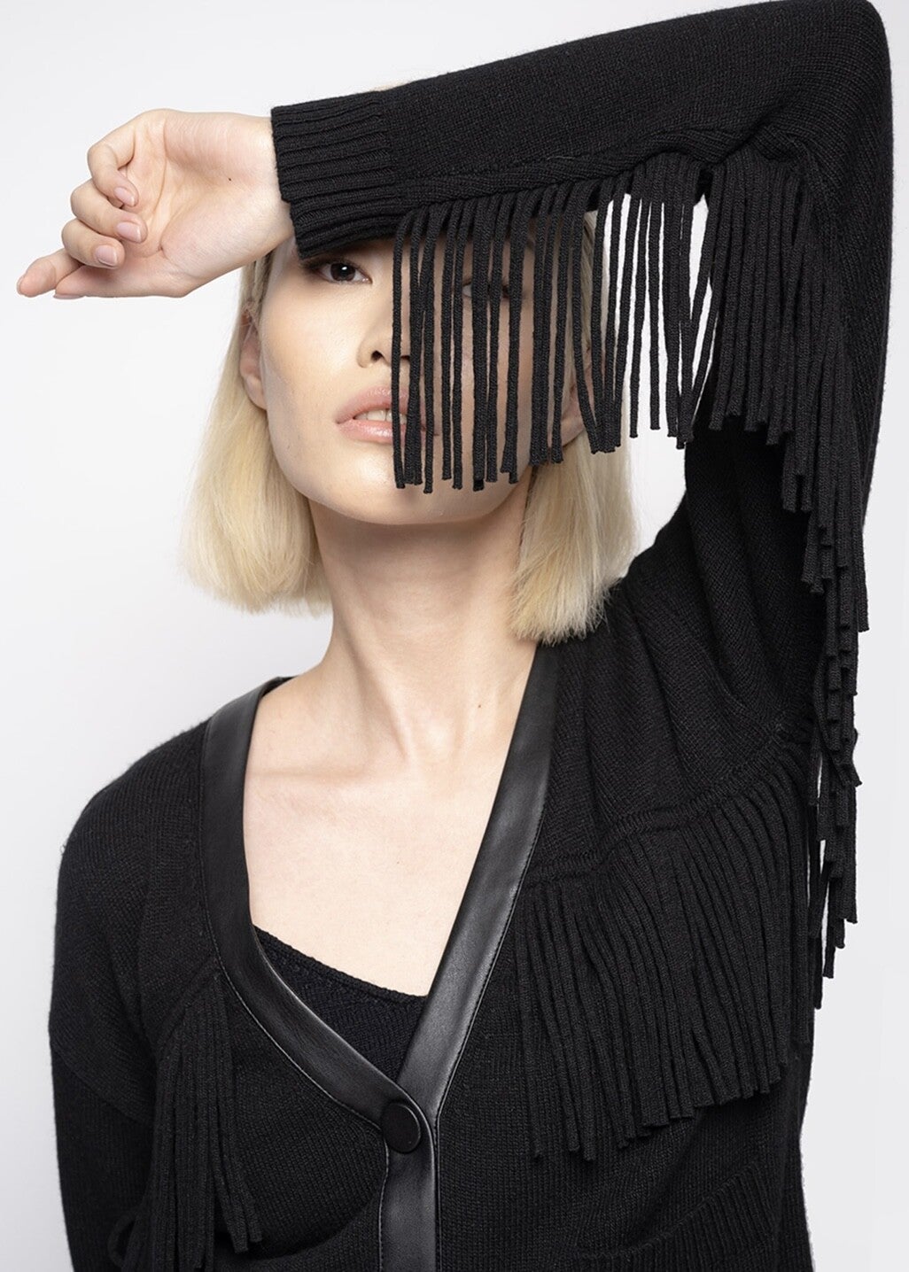 Korte boxy cardigan van gestikt kasjmier en wolmixgaren, met franjes aan de voorkant en de mouwen. Opening met rand in lederlook en opgezette zakken vooraan. Knoopsluiting.