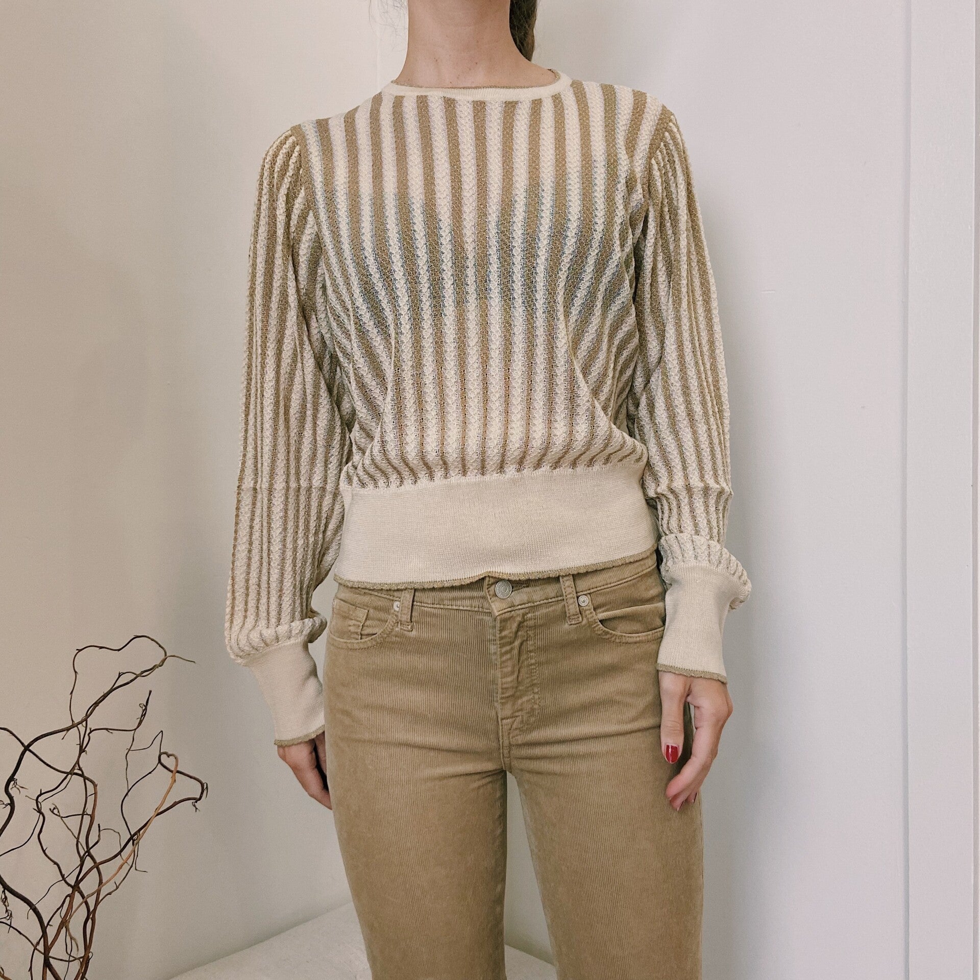 Sweater met ronde hals, brede manchetten en tailleboord, en gouden lurex strepen.