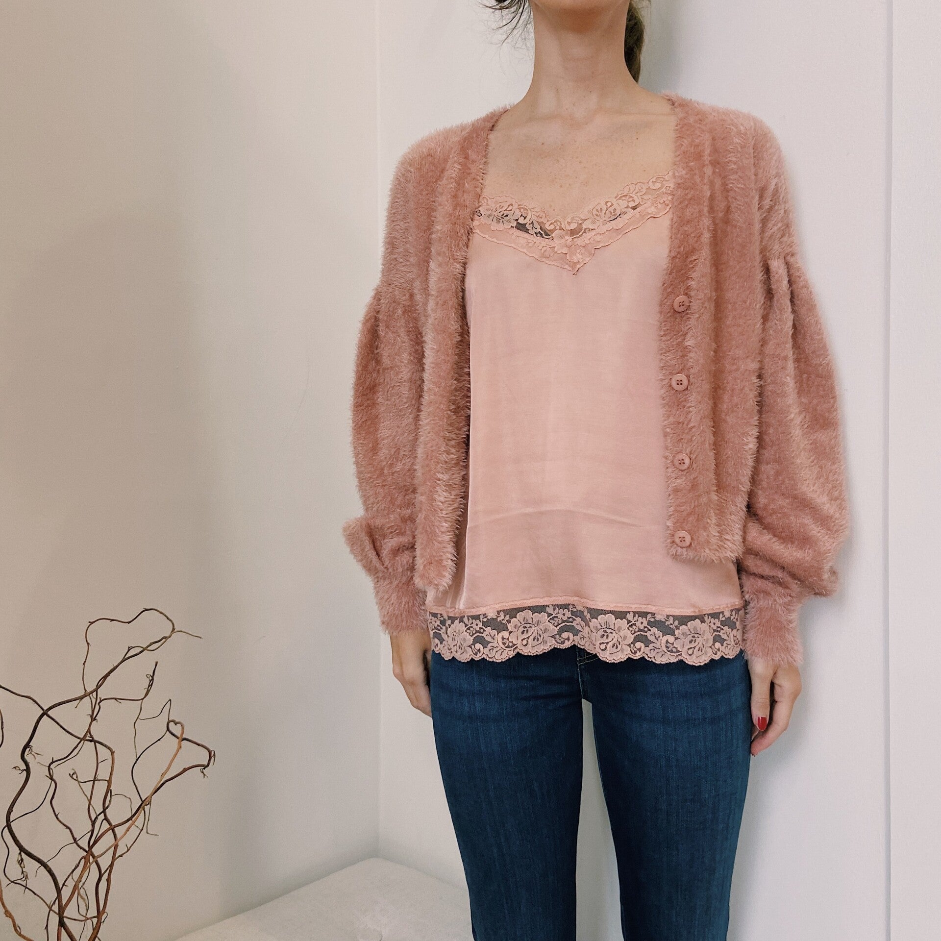 Combi trui (trui die ook als cardigan kan worden gedragen) met losse, aangezette mouwen en logoknopen.