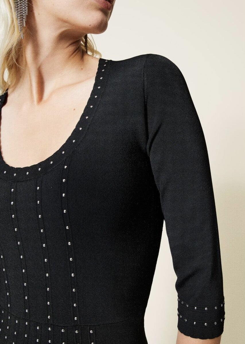 Korte jurk van stretch viscose crêpe met metalen studs en driekwart mouwen.