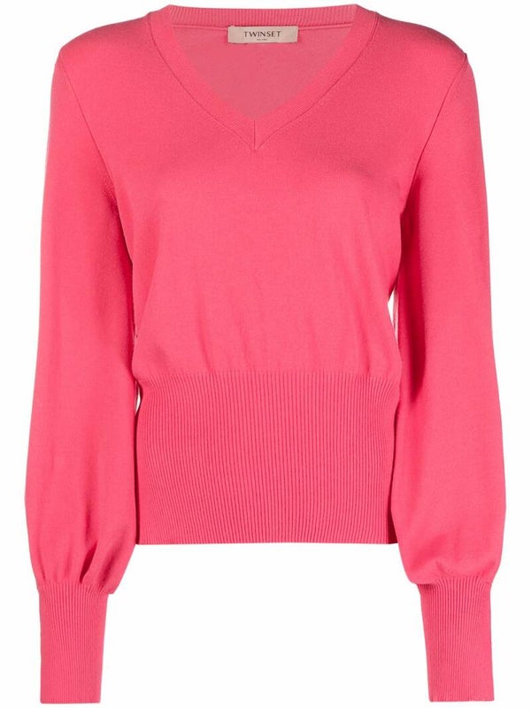Trui van stretchviscose met V-hals, wijde ballonmouwen met plooien onderaan, geribde manchetten en splitten.