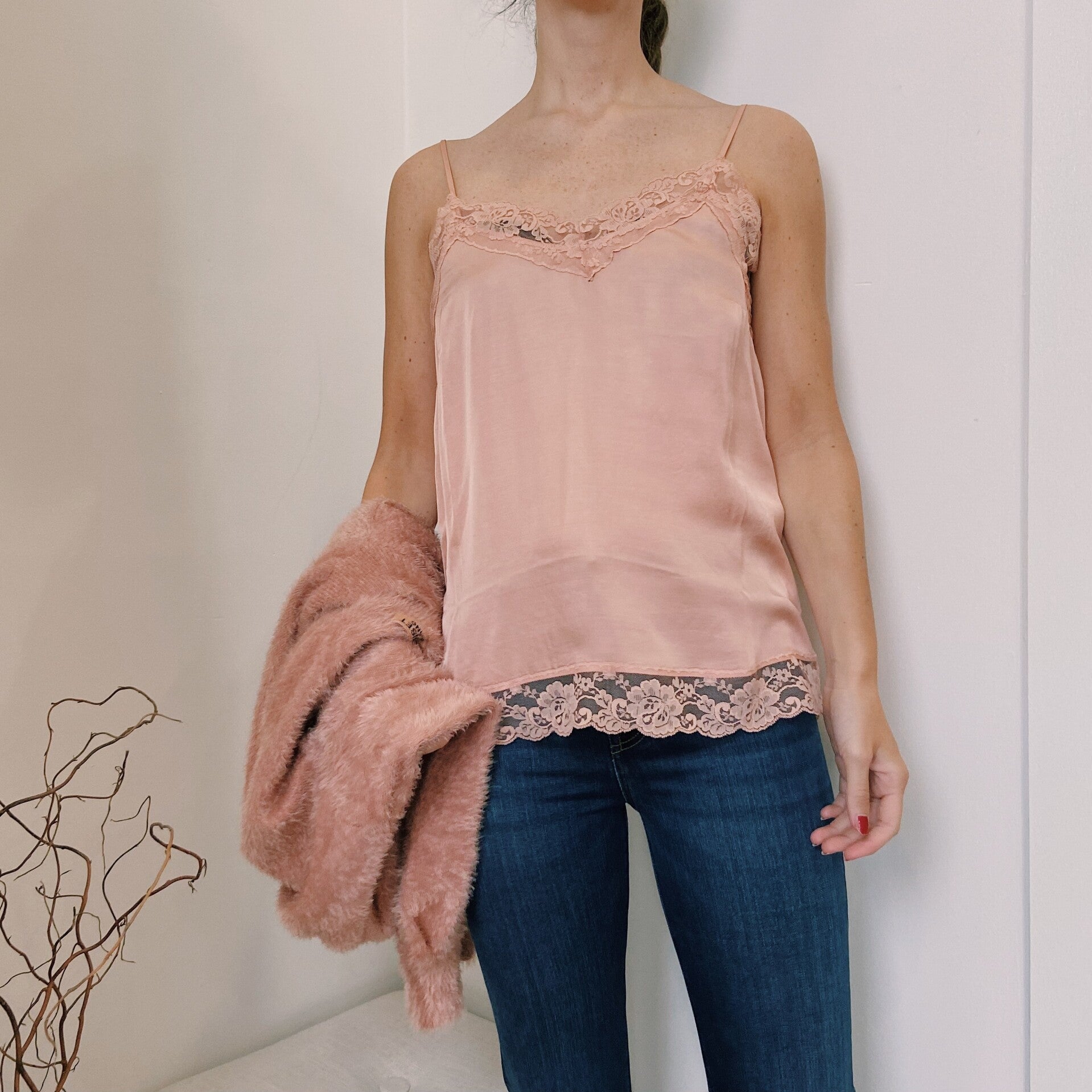 satijnen top met ingelegde geschulpte Valenciennes kanten details.
