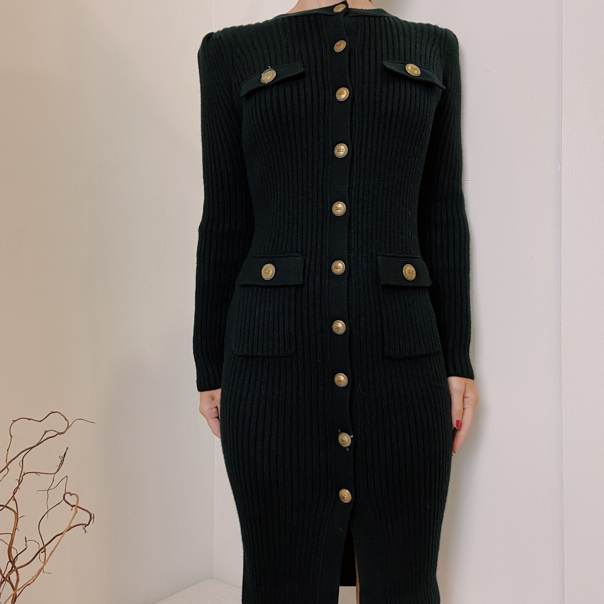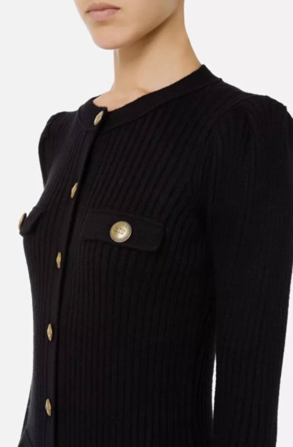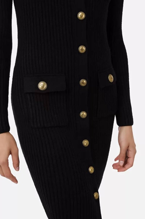 Nauw aansluitende halflange jurk in ribbreisel met knoopsluiting en zakjes vooraan, schoudervullingen en subtiele plooitjes.