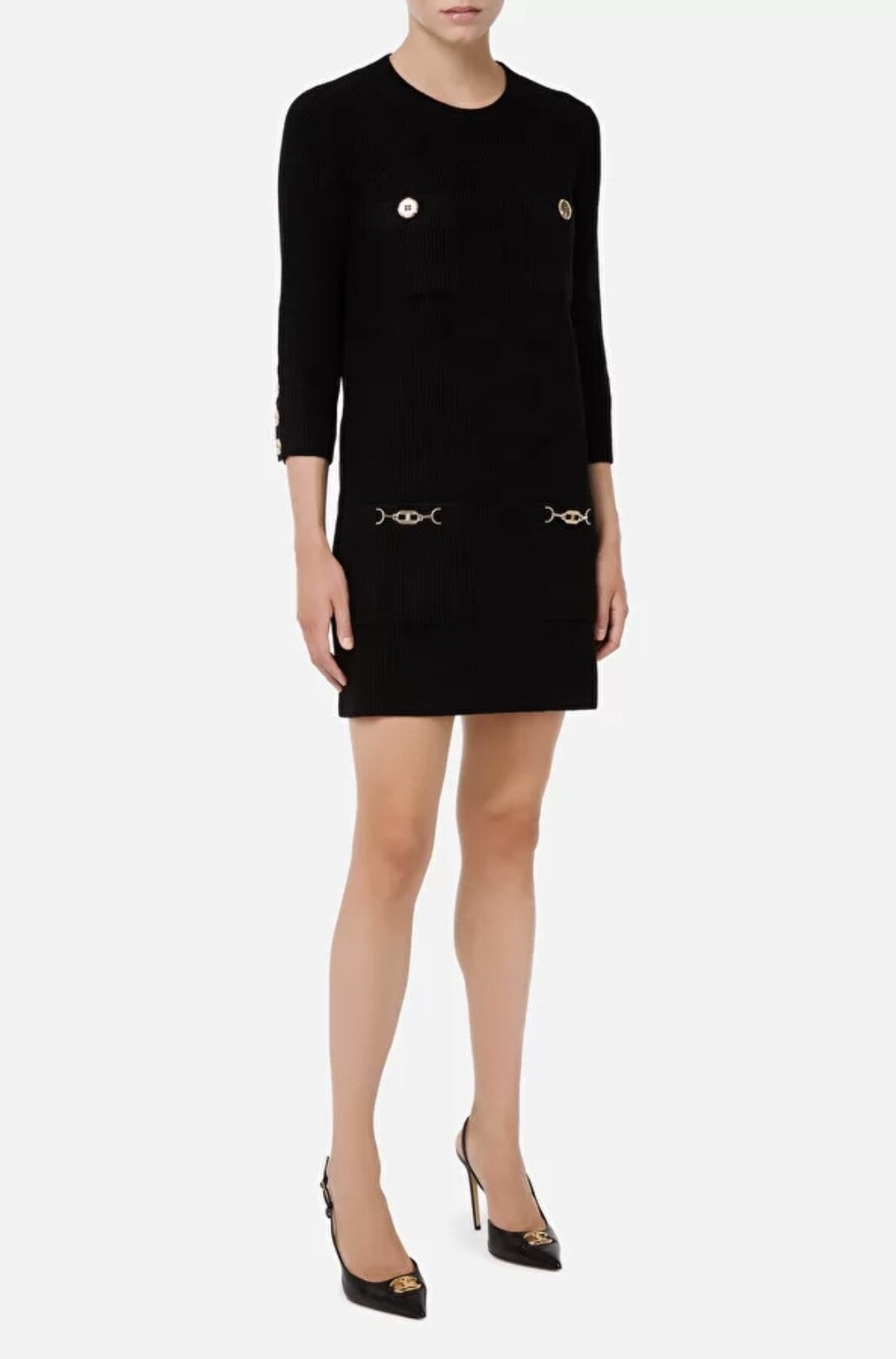 Korte boxy jurk met ronde hals en driekwart mouwen, borstzakjes met gouden knopen en heupzakjes met paardenbit.