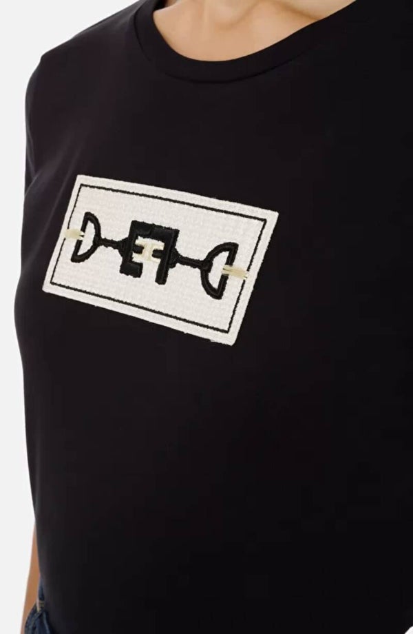 Nauw aansluitende t-shirt met ronde hals en het kenmerkend Elisabetta Franchi paardenbit logo geborduurd op de borst.