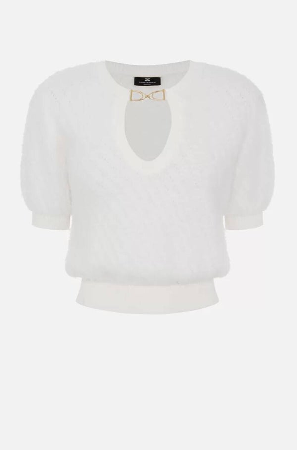 Kort furry truitje van wolmix met korte mouwen en een uitgesneden halslijn gesloten met een goudkleurig metalen paardenbit-accessoire.