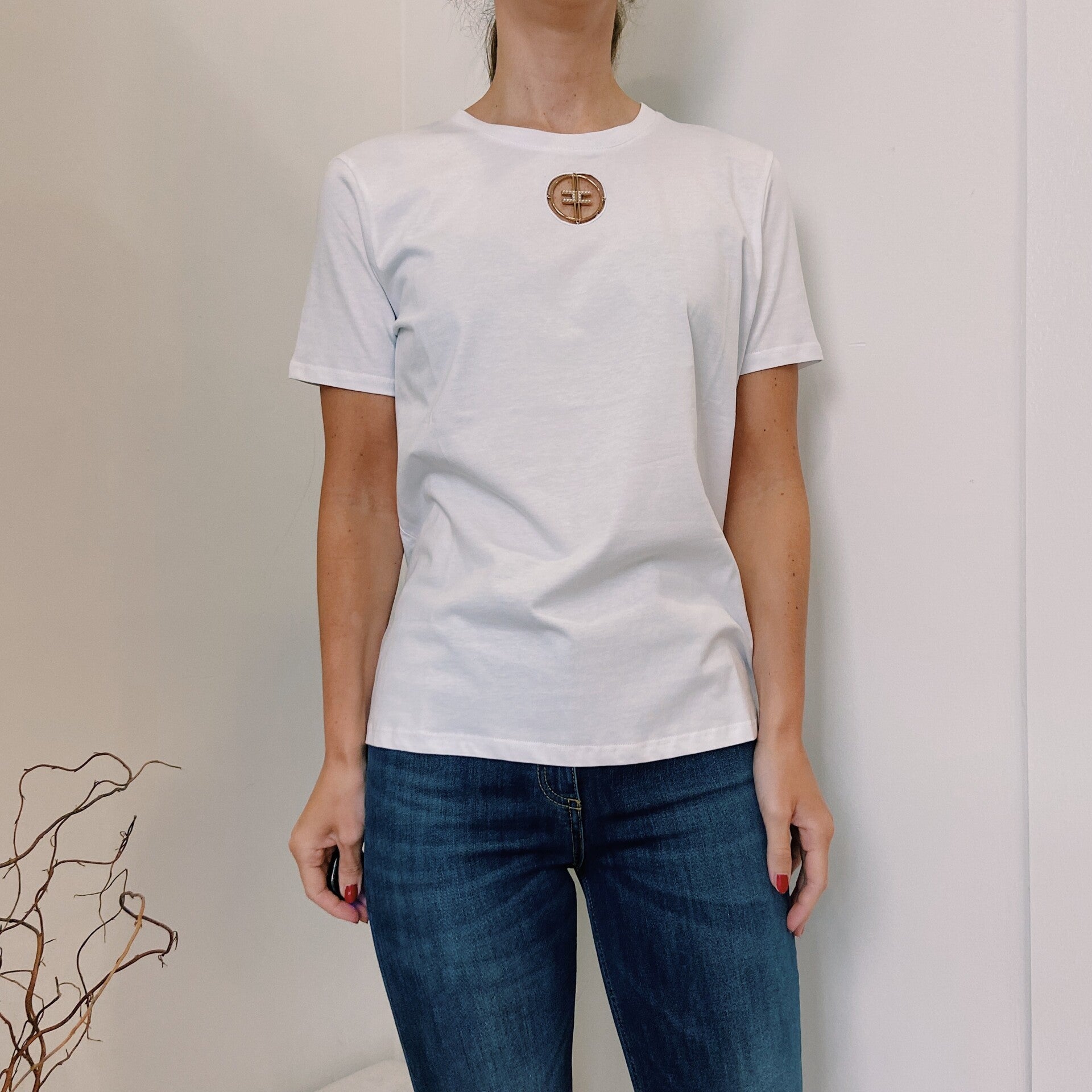 Nauw aansluitend t-shirt met ronde hals en uitsnijding onder de halslijn voor het metalen dubbel-C logo in een ronde applicatie.