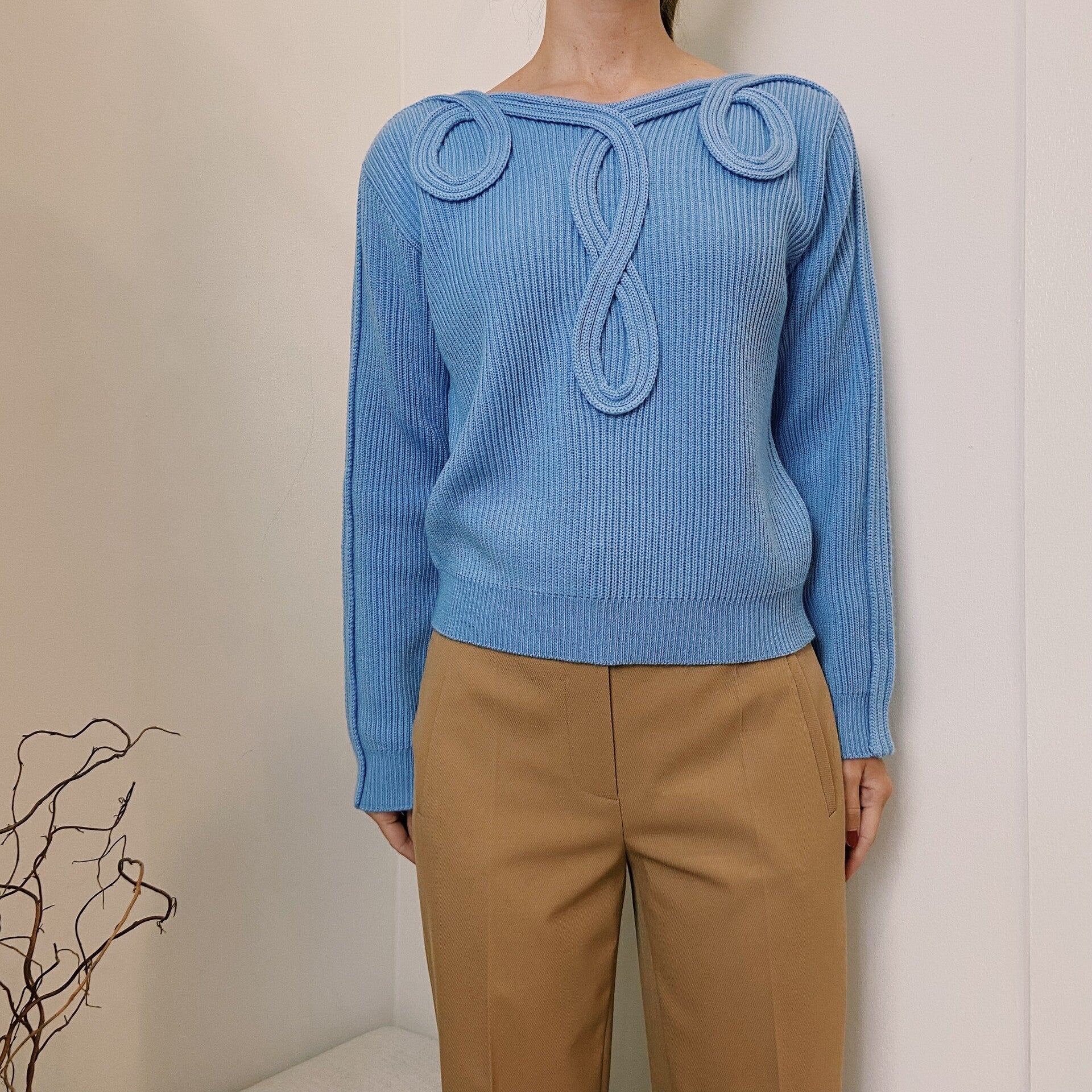 Geribde trui met opgebuurd motief en uitgesneden hals.