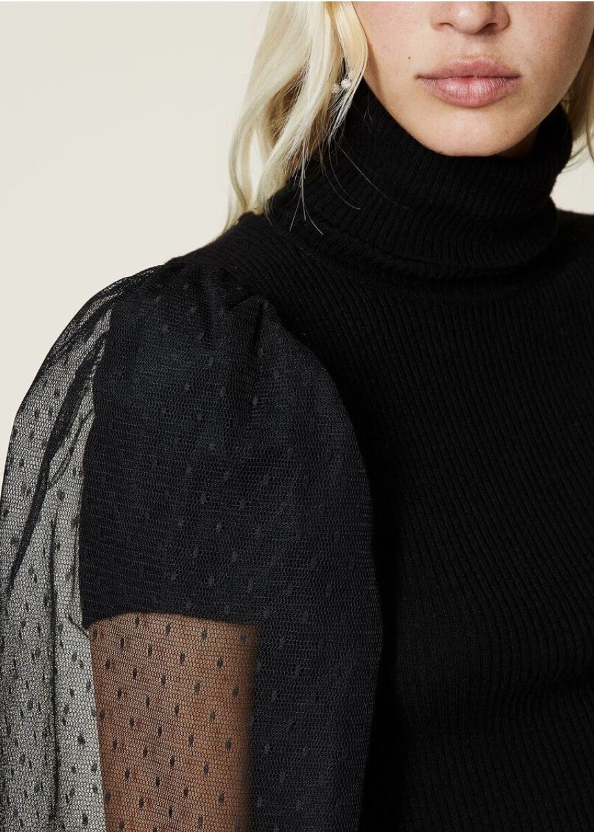 Coltrui van wolmix, getailleerd, met mouwen bestaande uit een laag gladde tule en een laag plumetis tule.